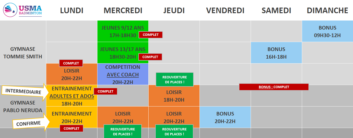 NB : certains créneaux peuvent être supprimés ponctuellement en fonction de l’actualité de la ville ou de l’association.