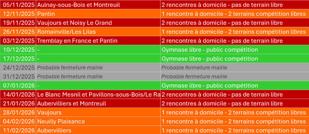 Voici le tableau prévisionnel des disponibilités (il sera complété plus tard pour les éventuels play-offs ou la Coupe du 93) :